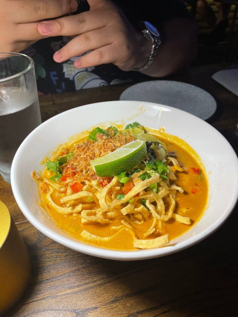 khao soi – northern thai wonton noodles in curry broth with fried noodles on top served with pickles $19